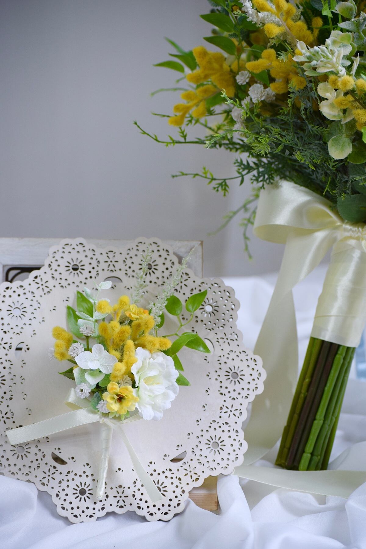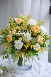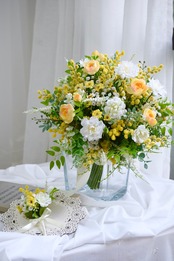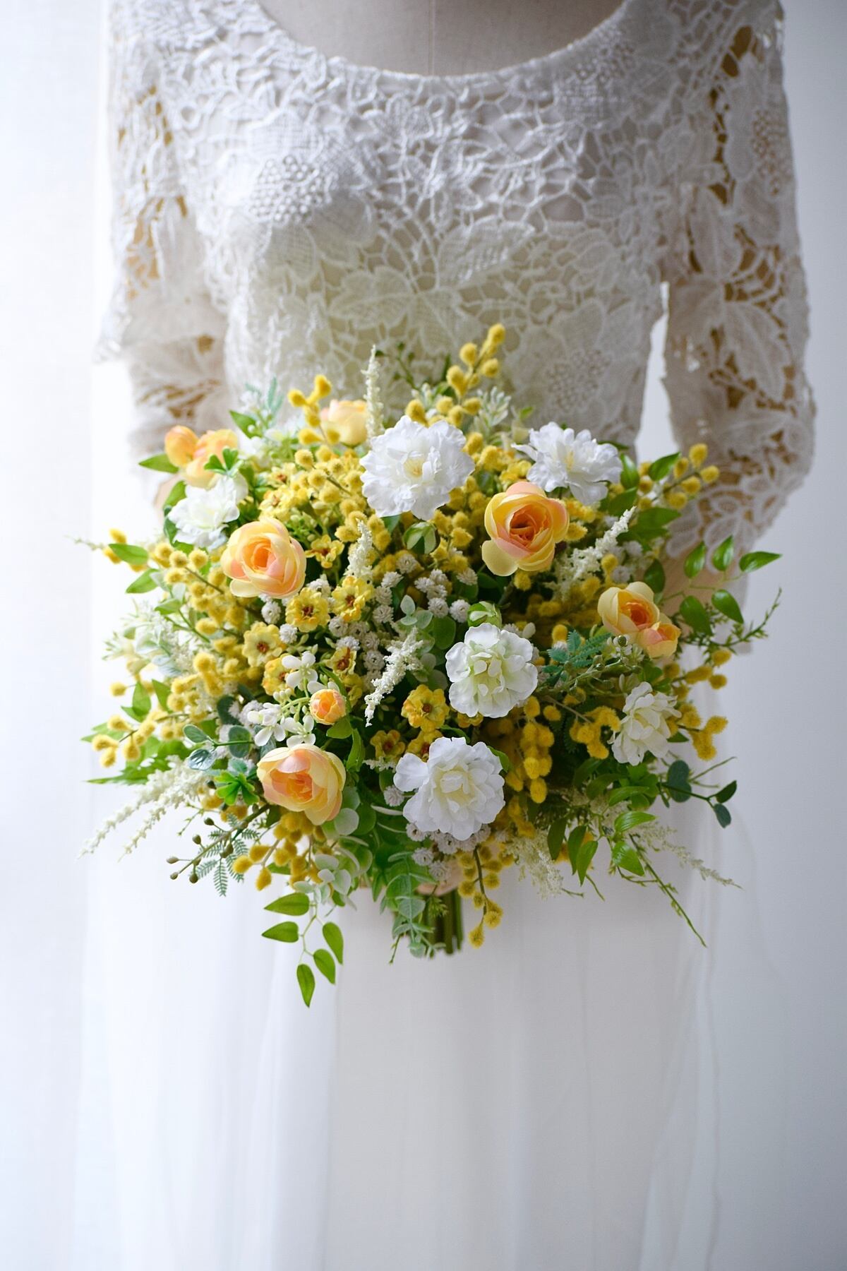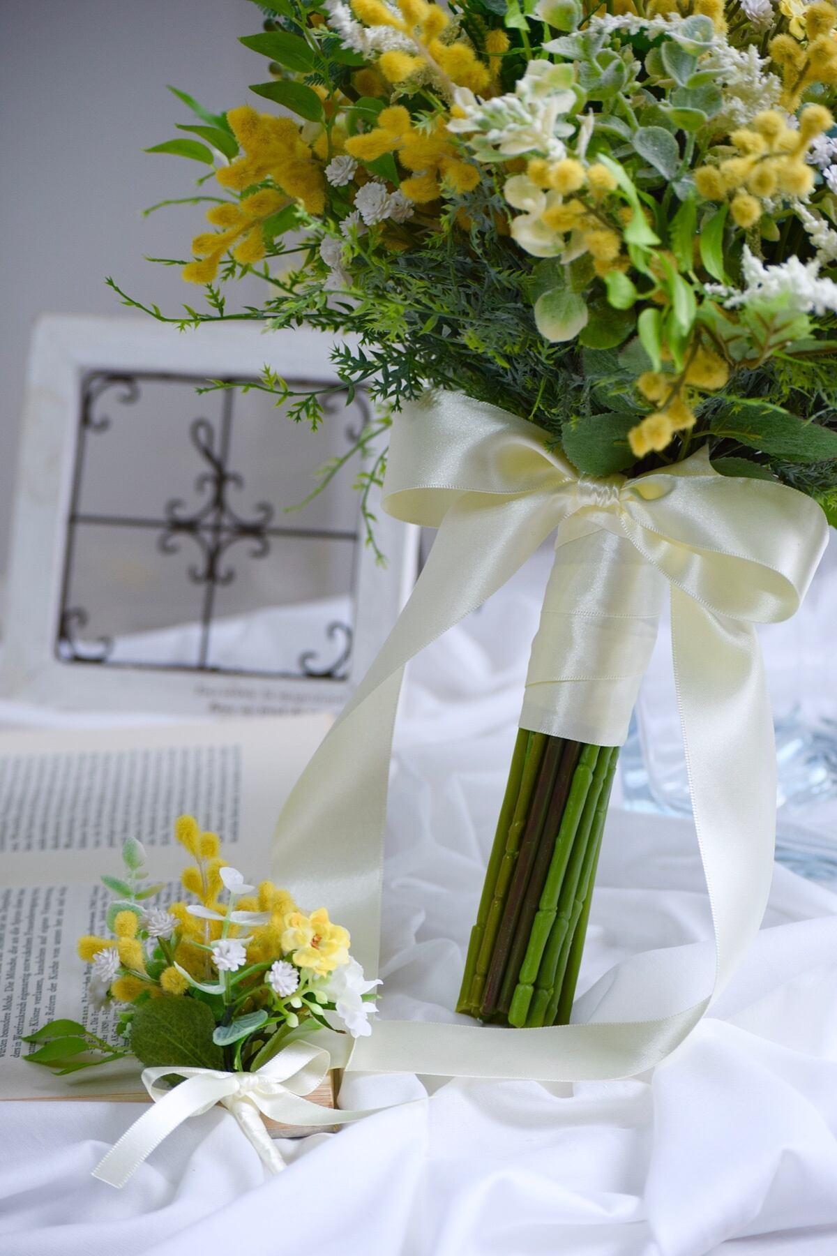 春を告げるミモザが主役。彼を想い草原をお散歩しながら1本ずつ野に咲く花を集めて束ねていく・・そんな物語を想い描いて形にしたウエディングブーケです。ナチュラルで心が春色に染まっていくように花嫁さまのそばに寄り添います。